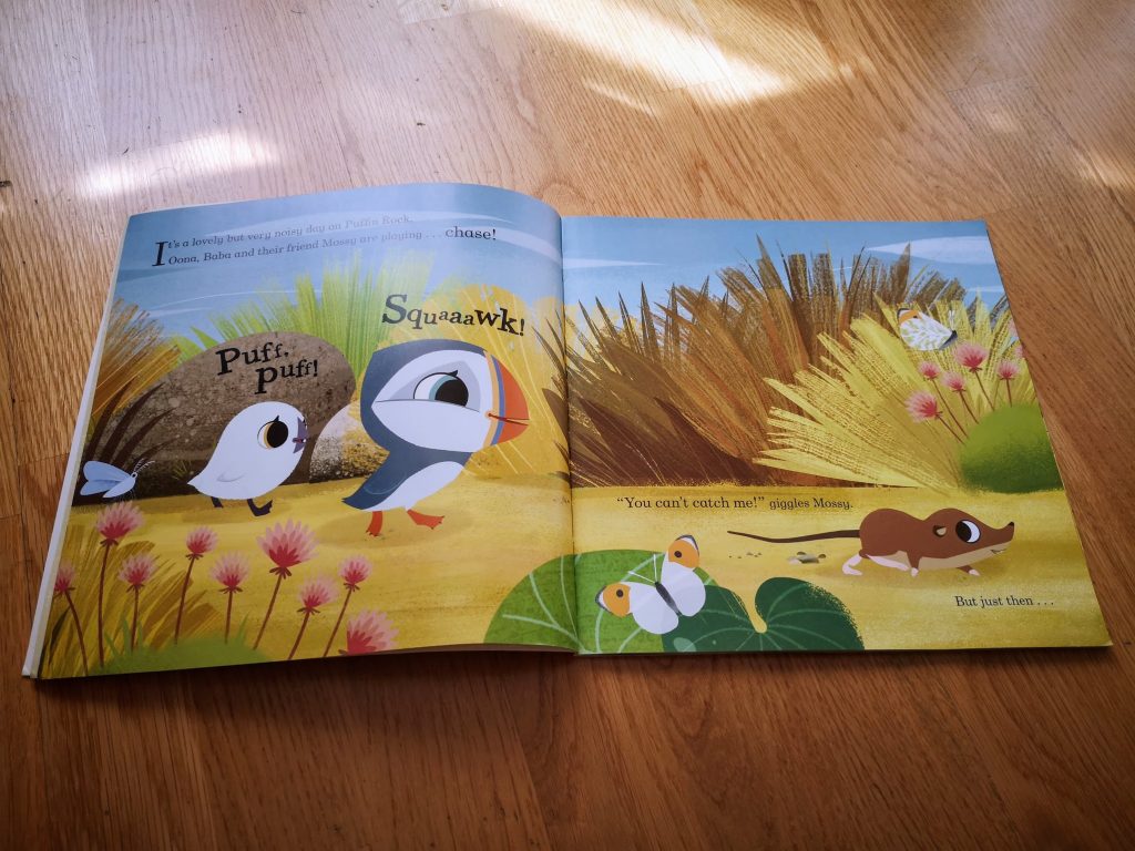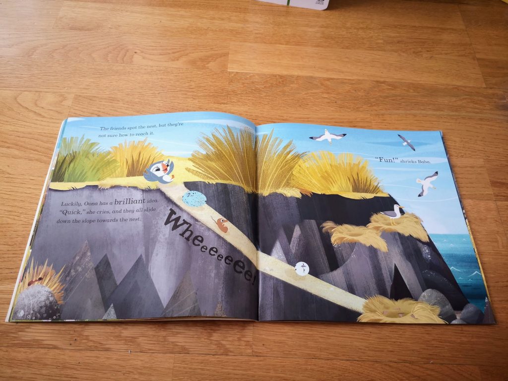 The three friends come across an egg whilst playing and set out to find its parents before it hatches. Little gosling now wants to play chase, just like Mossy, everytime we go to the park; he starts running saying “catch you” :))) and off he goes, giggling and laughing. He also loves to “wheeee” with them when they slide down the slopes. He loves slides and this is the closest he’s got to one in more than four weeks now. It’s a fun little story for the youngest ones, full of play and interjections and lots of sweetness between the three friends.
