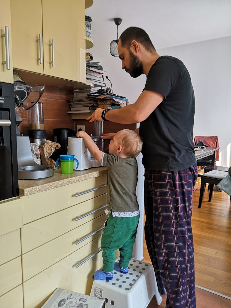 We showered little gosling with kisses when he woke up in the morning between us. “Do you know what day is today?” I asked and he replied with a smile on his face “cake!” Indeed, the promised highlight of the day had stuck with him :))). He joined his dad in the kitchen whilst he was making the cake (to the great exasperation of the cook who at a certain point vowed that would be the last time he would make cake with little gosling around). That’s because little gosling loves the kitchen robot and is very possessive of it, could play with it, fill it with anything and everything, from lego blocks to socks, stuffed animals, water or paper, all day long. So, a bit challenging for dad to keep his little hands away from the batter.
