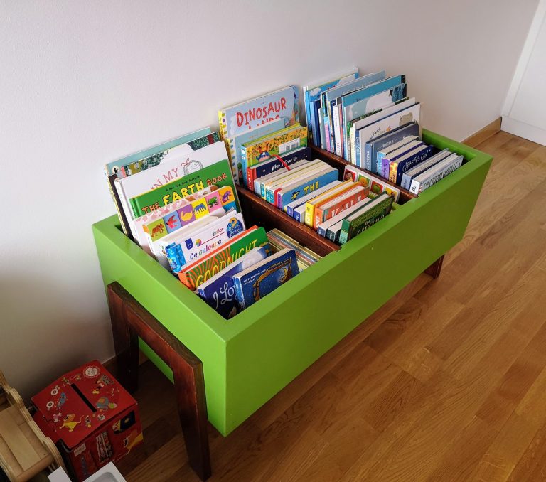 Little gosling’s pea-green book bin was one of the last additions, before we changed continents again. It’s a model based on something I had seen on Pinterest, that my husband then rescaled and made sturdier. I chose the colour (we had already explored the mustard yellow and turquoise for other pieces of furniture; we left before he could build something purple). I love it so much; such a happy, bright colour. It makes me feel good every time I see it. We set it up in little gosling’s room when he was almost 17 months old and placed all the books we had at the time (that we had previously kept on low shelves, next to his toys) inside. Little gosling came in and was initially thrown back by it; he’s always been resistant to change. However, he quickly started browsing through the books like a pro.