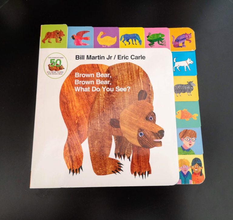 Bill Martin Jr and Eric Carle’s “Brown bear, brown bear, what do you see?” definitely helped little gosling fix his colours. A simple and effective book, it shows one animal on each double page, brightly colored (brown, red, yellow, blue, green, purple, white, black) and imagines a repetitive dialogue to identify the image that follows. Very catchy, fun and instructive little book for the youngest ones attempting to master the main colours.