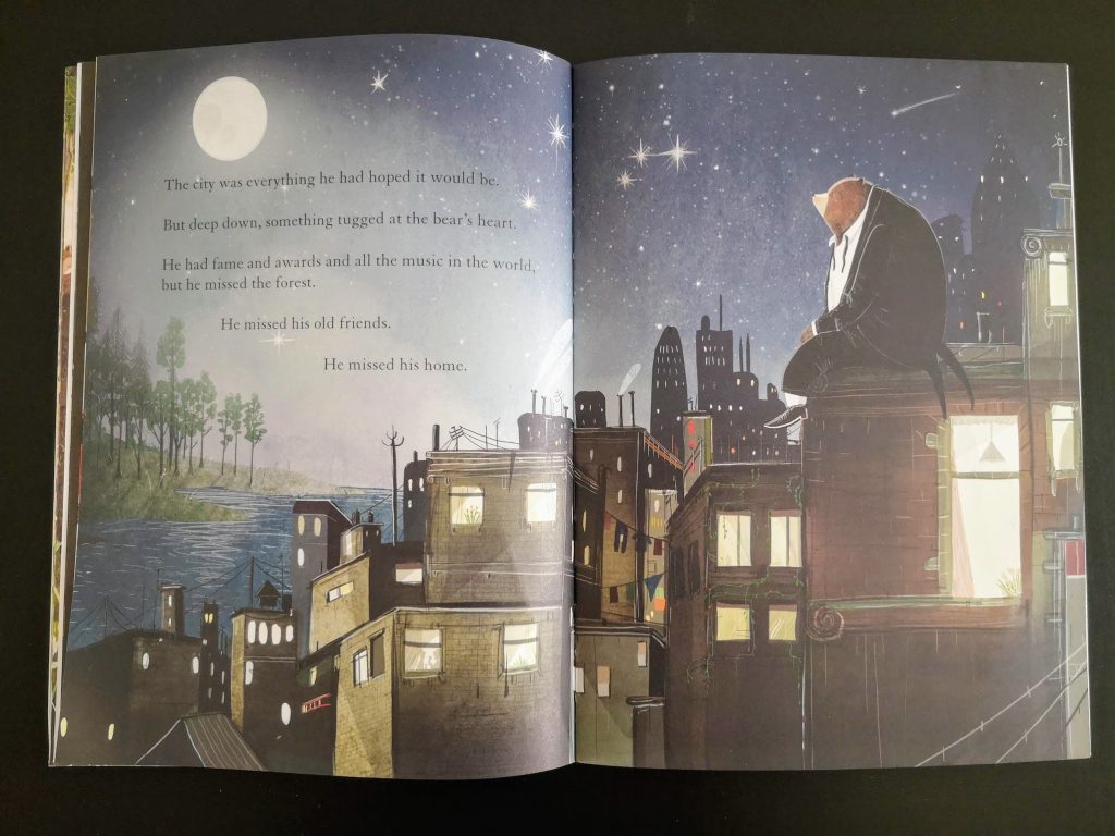 A good introduction to the notions of success, life-changing decisions and homesickness. I like the disinterested way in which it depicts friendship and the way in which it underlines the importance of the inextricable bonds with our roots and home. It shows the tough choices one may face to follow one’s dreams, but also that success can, but does not need to be lonely. All quite complex concepts for the youngest ones, but on a much deeper level than what they perceive at first sight. I love the forest illustrations, so warm and bright, as well as the melancholic bear. Very endearing! It features a beautiful double-page illustration of a full concert hall, all eyes on the big piano and the fancily dressed up bear, which serves as a good introduction to kids, together with the associated vocabulary.
