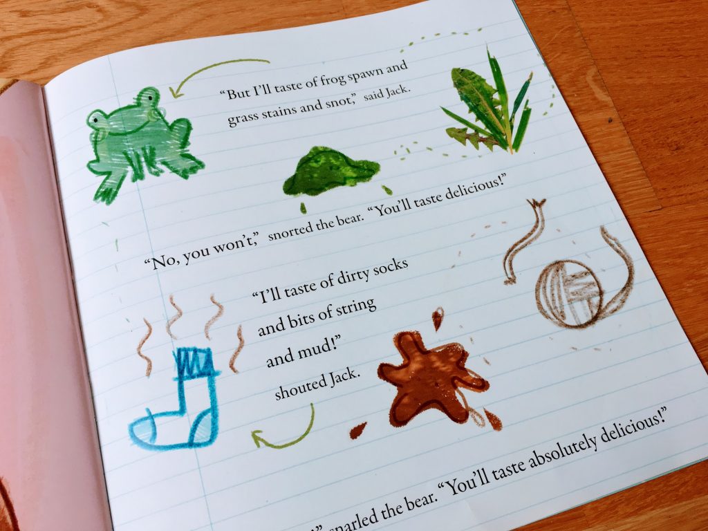 Jack loves egg sandwiches. One day, for lunch, he receives the unexpected visit of a …. hungry bear. He candidly (or not?!) keeps offering the bear from his huge pile of egg sandwiches, despite the bear grumpily announcing “bears don’t eat egg sandwiches”. Whilst getting more and more annoyed with Jack’s offering, the bear leisurely has him set himself up to be eaten. Jack gets out of being eaten at the very last moment by sheer wit. His attempts to dissuade the bear by enumerating what he finds disgusting tastes culminate in the dreaded “I’ll taste of egg sandwiches”. Interestingly enough, Jack behaves as nothing had happened and offers the bear a different kind of sandwich.