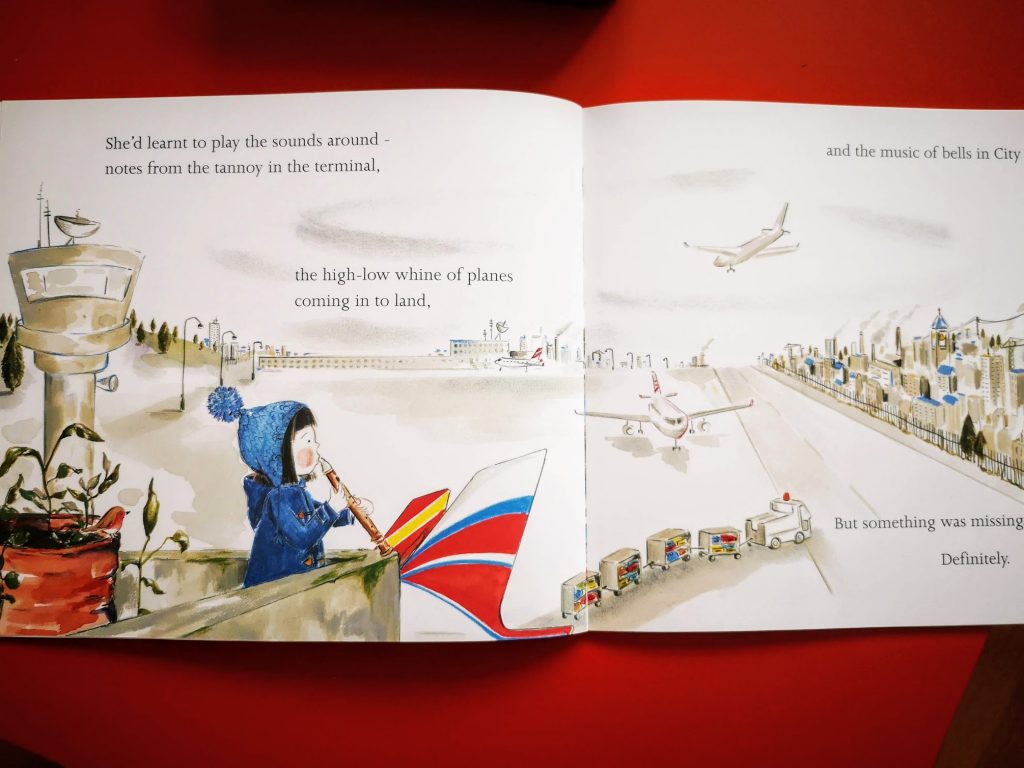 Little gosling liked watching the planes taking off and touching down, so intrigued by the control tower. He loved experimenting with the different sounds transcending the story: the noise from the planes, the recorder and harmonica the two kids play and the church bells chiming. We listened to some nice recorder renditions of “My heart will go on” and Buddy Greene on the harmonica. Ohh and those church bells! :))) He’s going diing-dooong on me when I least expect it. He’s declared his wish to see church bells. So, that’s one more thing on our long to do list together.