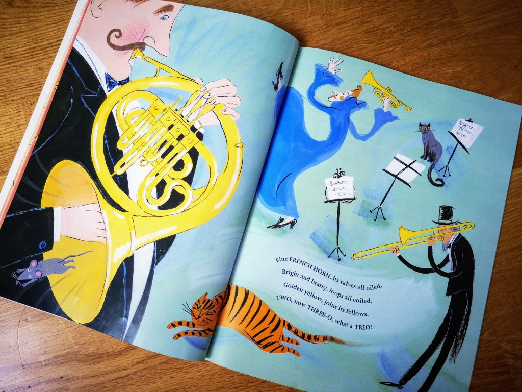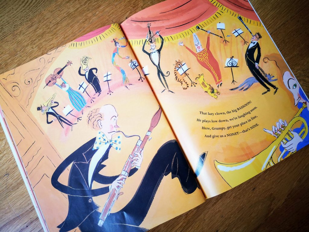 Illustrated in warm tones of pink and yellow and orange, it introduces one by one ten instruments – brass, reeds and strings included, as well as the vocabulary for the musical groups, culminating with a chamber group of ten that gives a concert in a fancy concert hall, closing with a bow and an “encore”. It’s a pretty accurate image and sequence of how a classical concert unfolds. Written in rhyme, the verses describe the physical appearance of instruments as much as the tones and feelings they convey to the audience. The portrayal of the members of the orchestra reflects the instrument they’re playing. And they all seem to be swaying and moving to the rhythm of the music. The pages are full of musical scores and musical notes flying around. Illustrations are so very fluid, flowing and, ultimately, musical.