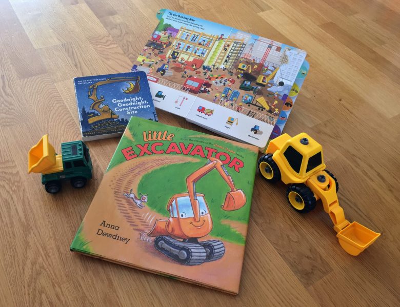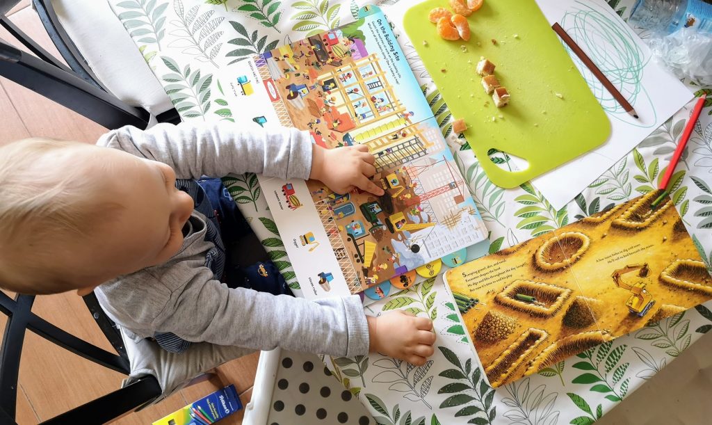All this led to a resurgence of his interest for “Goodnight, goodnight construction site”. That is one book that always features on our core reading list. We also read “Little excavator” and spent an enormous amount of time with the building site page in one of our search and find books. Sometimes, we did them all at once: little gosling showing me the rigs in the search and find books (by now, he knows all the little details) and mommy reading “Goodnight, goodnight construction site”.