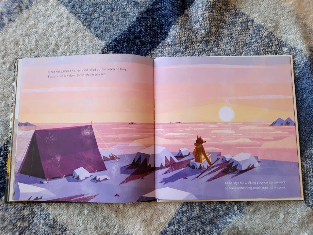 Fox goes on a quest to find the “fabulously fascinating flower” that his botany books are unable to reproduce. “A page with no picture”?! he repeats at this point, playfully, with an inquisitive movement of his cute little hand. We watch Fox prepare his hiking gear, setting off before sunrise, observe the well-known trees and mountain flowers and climb up to the very summit of the mountain, the only place where the rare golden glow can be found. There’s some excited fidgeting and bum bouncing and a big smile on little gosling’s face when fox finally sees the flower, and he gently caresses the drawing.