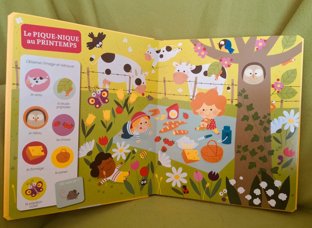 The one with the seasons is quite a big format, but still easy to grasp for a toddler, and includes nine pretty double-paged illustrations filled with seasonal motifs, animals and happenings, two per season (three for summer). On each of them, kids are encouraged to identify seven items (animals, plants, activities) as well as observe what a cute little mouse is up to. There is no story, which provides so much space for story lines and language development, and the names of the items are written down (some of them, quite usefully so, with the book being in French). Again, I found this a useful, interactive introduction to seasons for my toddler. Particularly as for each season, one of the illustrations depicts the transformations the same garden goes through, in terms of tree foliage, colours, fruits, vegetables, animals. There’s a lot of information on these pages, without it feeling crammed. The favourites so far (love at first sight) were the depictions of a blue dragon-fly (“libellule” in French, “libelula” in Romanian – one of the favourite words, currently) and one of the spring illustrations showing toddlers enjoying a picnic “à la française“,  with different cheeses, baguette and strawberries. He stares at it and we inevitably end up enjoying together a platter of cheese, fruits and cashew nuts. What a treat!