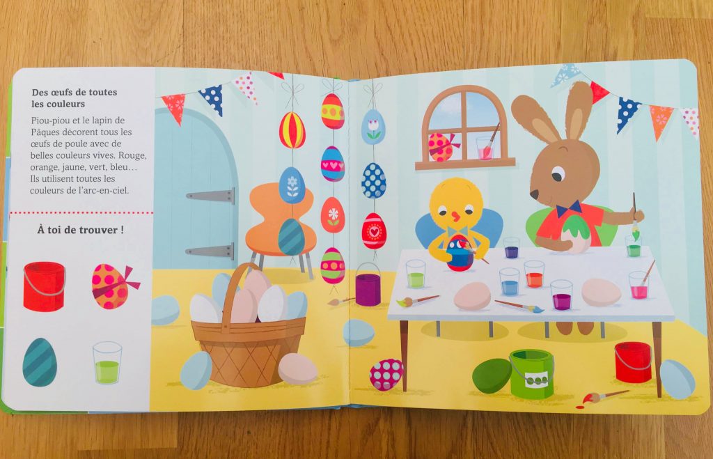 The Easter book tells a cute little story about a chick, Piou-Piou, who loves Easter and dreams about becoming an Easter bunny when he grows up. He sets out to help the Easter bunny in painting the eggs and hiding them for the egg hunt. It is sweet, beautifully colored and a lovely introduction to the motifs and joys of the Easter holiday. Each double-sided page includes one para of text (in French) and asks kids to observe and find four items in the attached illustration: lots of decorated eggs, chicks, bunnies, sheep, birds, flowers and bells. Little gosling would ask to “read piou-piou”, brings the book, opens to the pages he wants and simply says “read that” and then he plays to finding the items. He loves finding the Easter eggs.