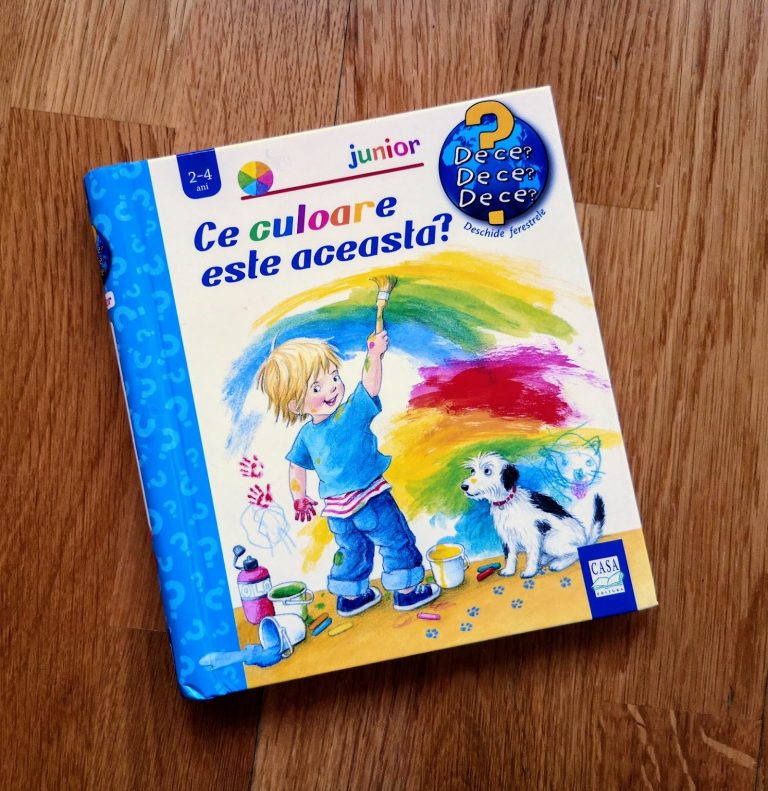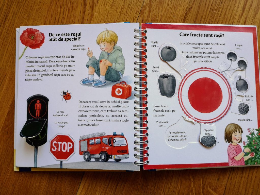 “Ce culoare este aceasta?” (“What colour is this?”, in English) was the first book that helped us explore colours with little gosling, a bit before he showed any interest in them. It was also the first “lift the flap” book that he came across and he was hooked for days by some of the activities. He was less interested in the colours part at the time. He instantly liked the smaller flaps, mainly on the green (discover the flowers one can find on the meadows) and red (guess the colours of fruits) pages. He also loved flipping the flap with a white wall being painted in yellow.