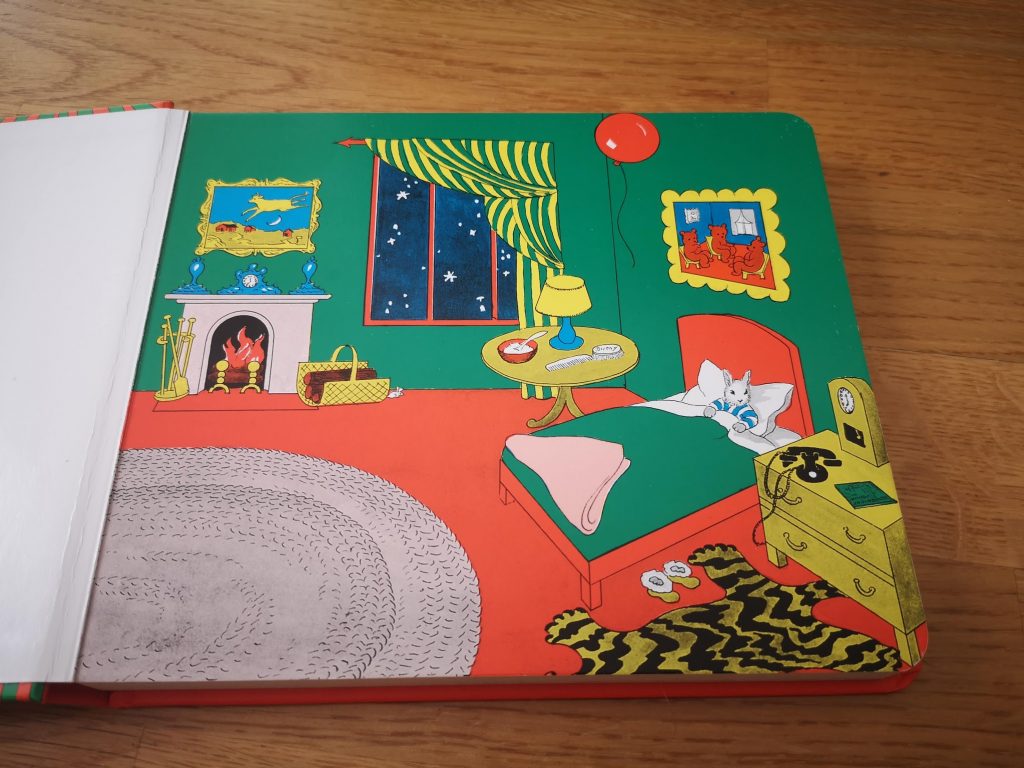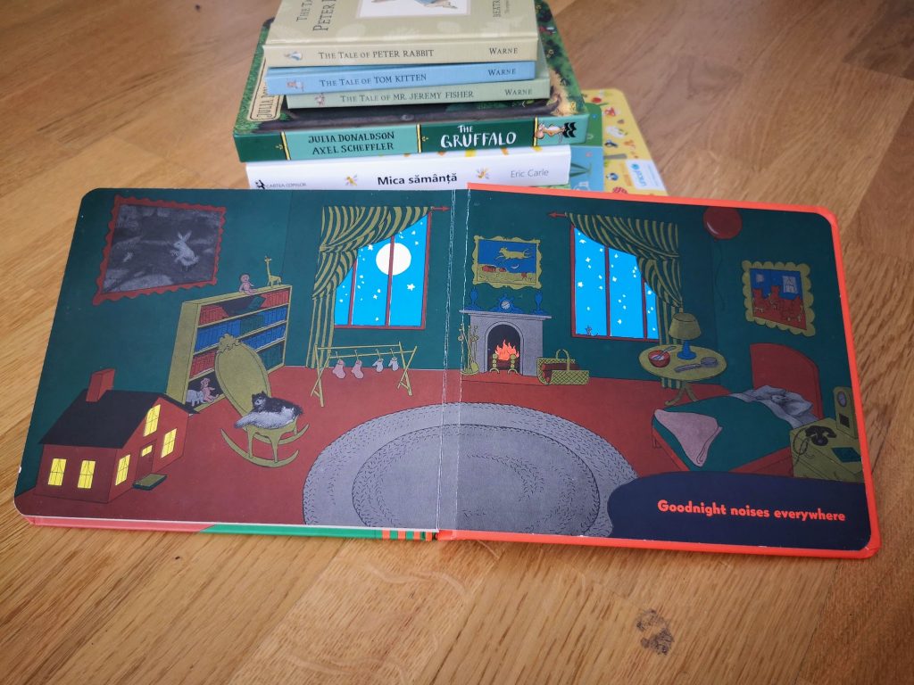 “Goodnight moon” is the last book we read before we switch off the light, and has been for the past two months. The book depicts one bedroom – a little bunny’s bedroom, seen from different angles, identifying in separate close-ups (in black and white images) some of the objects in it and goes on saying goodbye to these objects in rhyme. I suspect this may have triggered some memories that made little gosling particularly attached to the book.