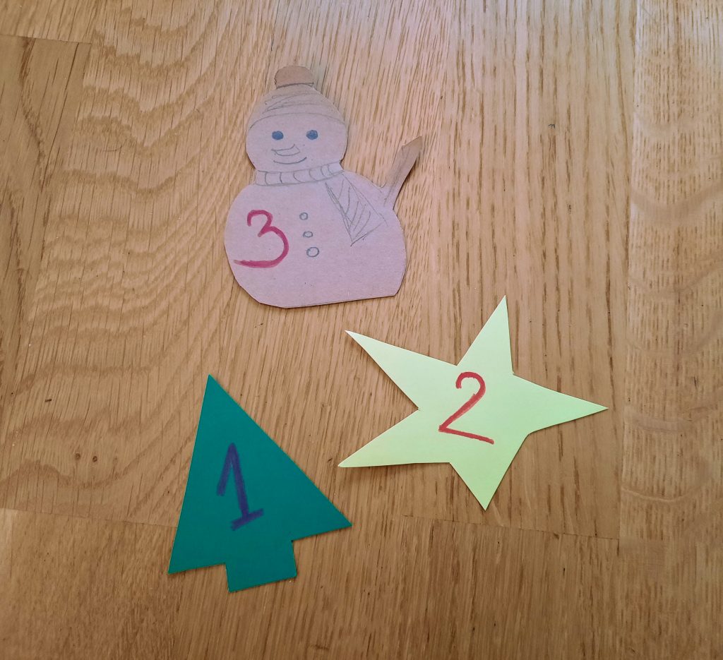 I wrapped them individually in Christmas themed papers of different colours. I attached to each book a number, written on small cardboard cards, which I cut out in Christmas-themed motifs: Christmas globes, snowmen and Christmas trees. I piled the books in random order, so little gosling had to find each time the number corresponding to the day in December. I also prepared a table with the order of the titles, to follow and track our countdown progress (see below for the different titles selected).