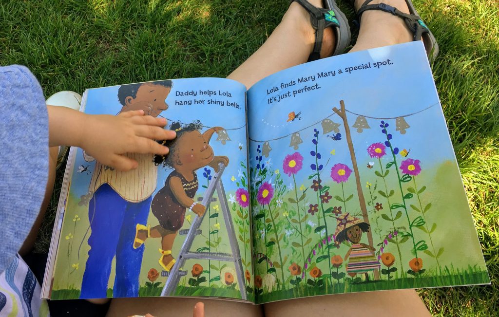 It’s a cute story about Lola (who can’t be so much older than little gosling), who loves “Mary Mary quite contrary” so much that she wants to have a garden just like Mary’s in her book. Her mom and dad are there to help her choose the flowers (out of books taken out from the library) buy the seeds, plant the garden, decorate it and then enjoy it over a picnic with her friends. It’s a short text, very much fit for young toddlers, with warm illustrations projecting a peaceful, happy childhood, surrounded by a loving family.. And books.