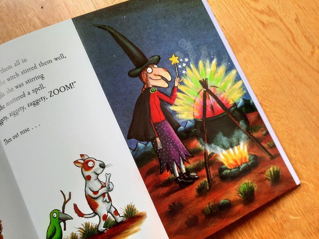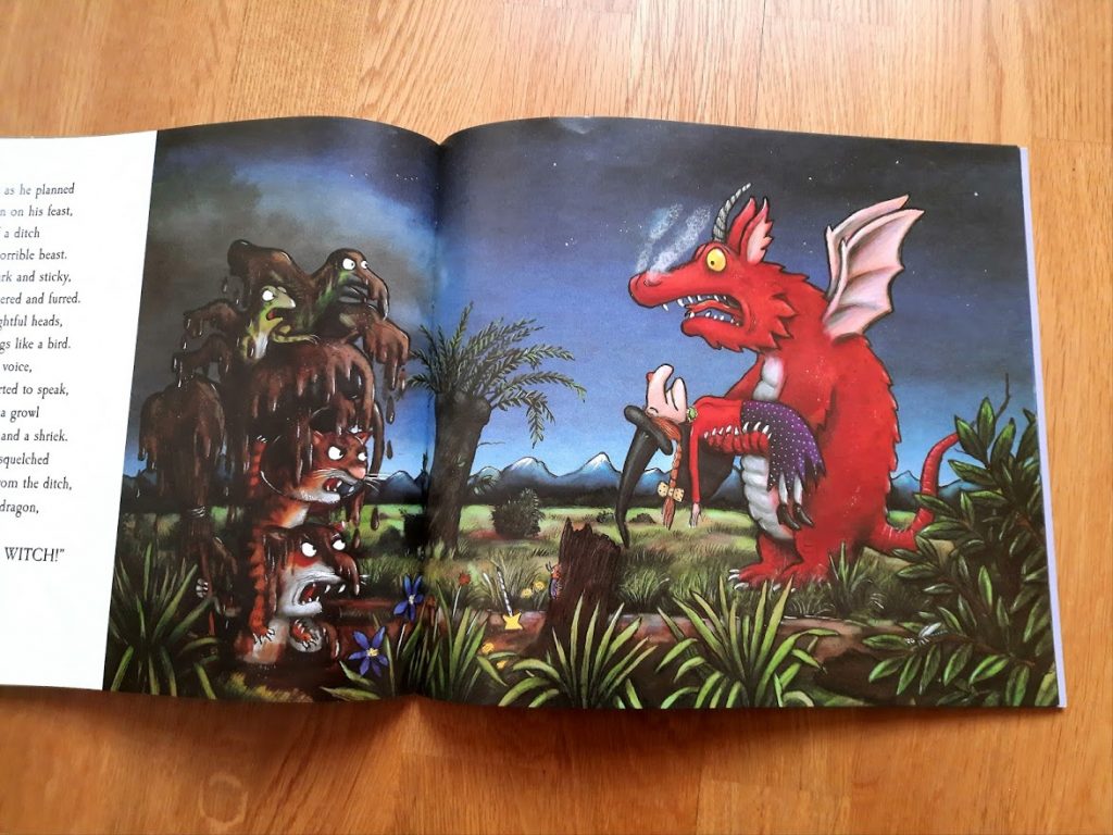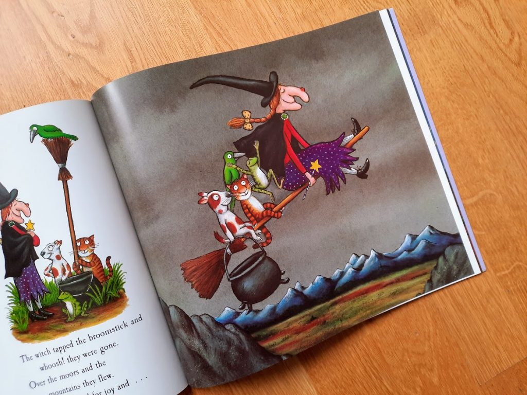 The wonderfully catchy rhyme (one of those that stick inadvertently and definitively onto your cortex) goes about the witch losing some of her items, one after the other. As she does, she repays the animals who help her get them back by taking them on her broom. Until… the broom snaps in two!!! A chase ensues, with a dragon and a terrible four-headed monster involved. But the story has a happy ending! The witch gets to show she can do magic, when all her gratefulness translates into a plane comfortable-like broom.