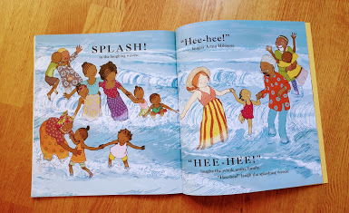This is a lovely story about an extended family enjoying a day at the beach and eventually being lured by little Anna’s contagious laughter “hee-hee-hee-hee” to join in to playing and “splashing with the laughing waves”. A splendidly joyful celebration of family time at the beach! It gives so much pleasure to read and it is thoroughly enjoyable. I love the portrayal of such a united extended (and mixed race) family ultimately renouncing their individual occupations to have fun together.. We live far from our families and our families live quite far from each other, so little gosling will likely not experience anything like this.