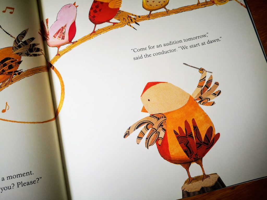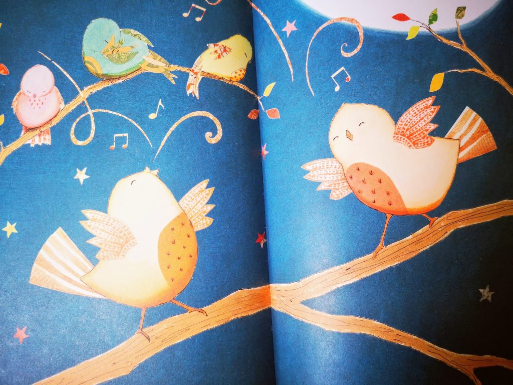 It’s a sweet story, with lovely, warm coloured, soothing illustrations, full of tiny, chubby birds and musical notes flowing and floating around. It’s a gentle introduction to birds and music themes, with specific vocabulary. With just a tiny little bit of imagination, one could almost hear the birds’ song. I almost feel sorry there’s no button to push anywhere for some trills. Above all else, I like its message of knowing and being true and content with who you are. Little gosling is fascinated by the conductor of the chorus and is looking for it on all pages. He gets so happy when tiny Peep finds another nightingale friend and they sing together. My favourite part is hearing him say “nightingale”; it’s quite a complicated word. And he has such a sweet way of saying “Peep”…