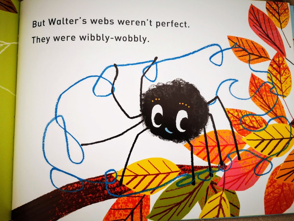 Walter is a spider with a particularly creative style, trying to fit in and spin webs just like his friends. However hard he tries, his webs come out differently and they all get blown away by the wind. He tries all the different shapes (triangle, square, rectangle, diamond, circle) and never gets discouraged; he learns something from each attempt and tries again and again, until… he combines all the shapes into a truly wonderful web! Such a simple concept and so many lessons to draw from it!