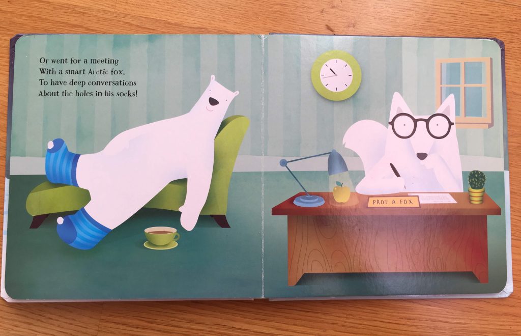 Some of the activities he is portrayed engaging in are decidedly wintery, but others less, like canoeing or snorkeling. One also gets to meet some other polar friends. Curling with penguins was an early favourite, back when little gosling was into penguins. Recently, we’ve spent more time on the dinner with the seal and the walrus, diseccating the dinner table; the pizza the seal is having is such a show stealer. My absolute favourite is the “deep conversation about the holes in his socks” with the “smart Arctic fox”. Sometimes daddy mimes the different activities whilst mommy is reading, causing all sorts of giggles and squeaks.