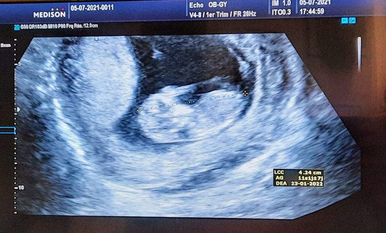 The following day, six weeks into the pregnancy, I had a first look at my baby. I heard the heartbeat for the first time and confirmed it was in the right place, inside the uterus, on the ER ultrasound machine. All was fine. The urine test came back normal 🙂 I got this one ultrasound image that I showed my husband who was waiting for me outside. He had not been allowed to accompany me in the ER because of COVID-19 restrictions. What a relief! And what a surprise to hear the baby’s heartbeat so early on! I had not expected that. It was so alert..